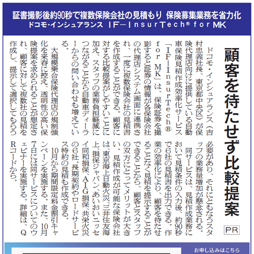 お客さまがお持ちの保険証券をスマートフォン、タブレット等のカメラで撮影することでお見積もりに必要な情報入力を省力化するInsurTechサービスです。